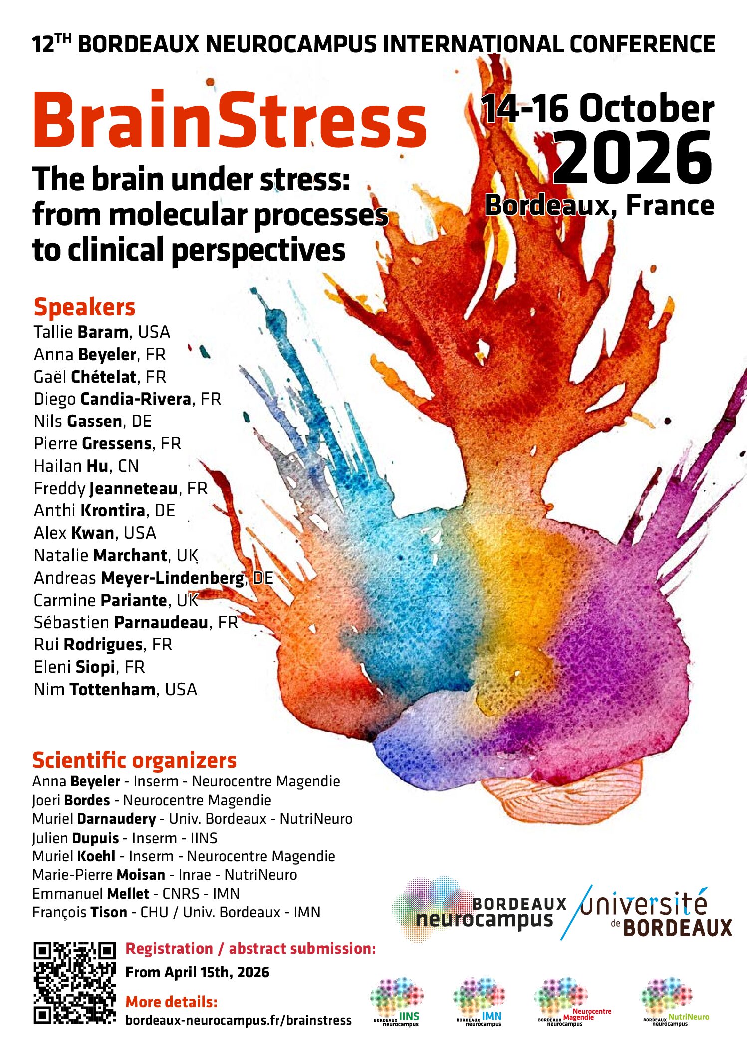 The conference, entitled “BrainStress – The brain under stress: from molecular processes to clinical perspectives” will take place in Bordeaux (FR), on October 14-16, 2026.